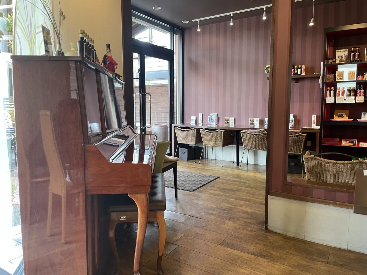 店内はブラウンを基調とした落ち着いた雰囲気。珍しいブラウンカラーピアノも置いてありました。