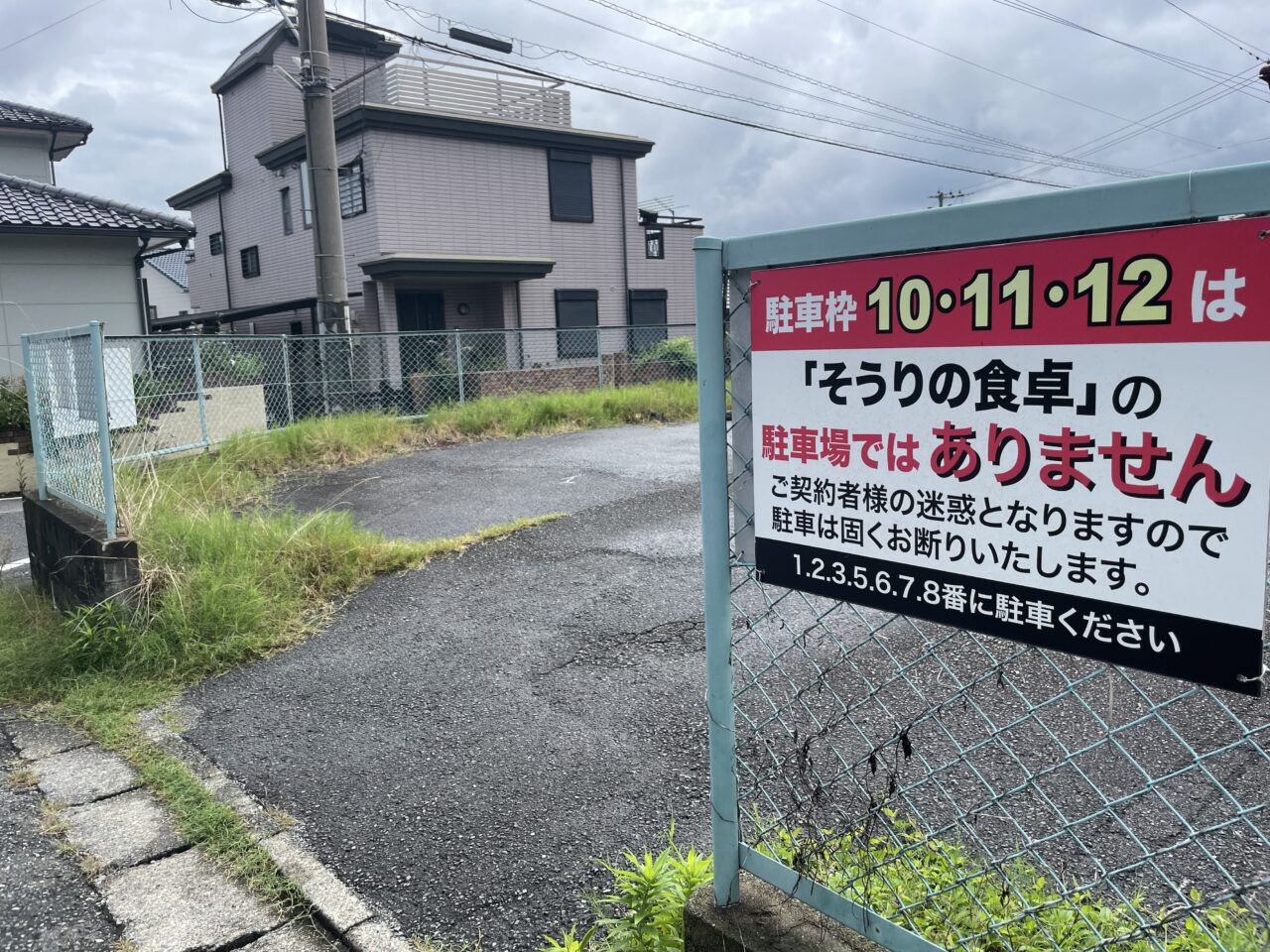 1.2.3.5.6.7.8番がそうりの食卓専用駐車場となっており、10.11.12番は別のご契約者様がいますので、番号に注意して停めてください。