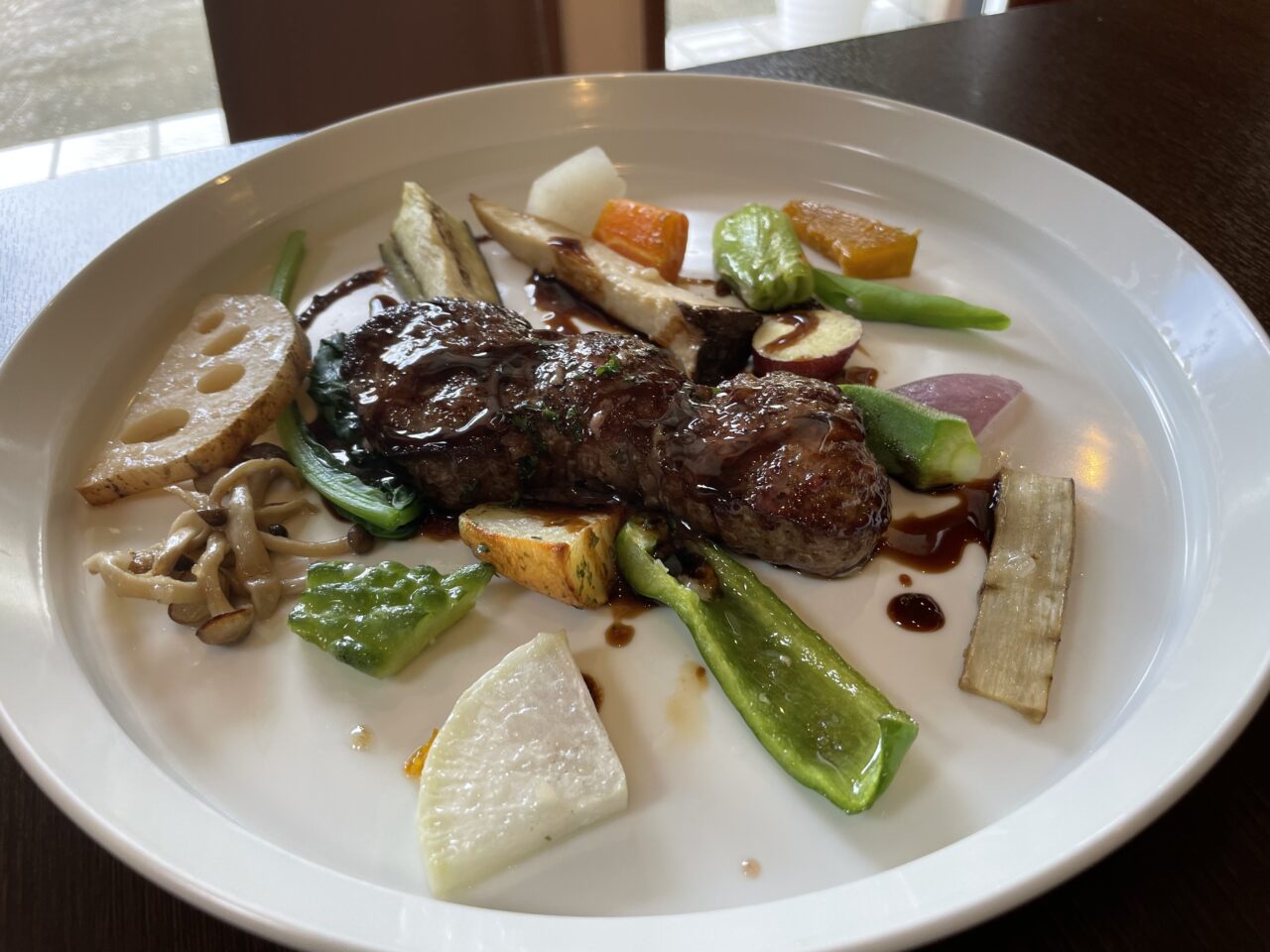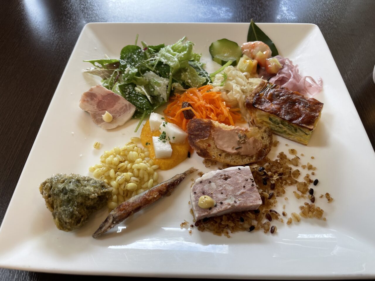 前菜が盛りだくさん。ハムやキッシュ、サラダやピクルスなどなど。自家製の人参ドレッシングが山芋の下に敷いてあったのですが、甘みと酸味のバランスが絶妙でよく合いました。