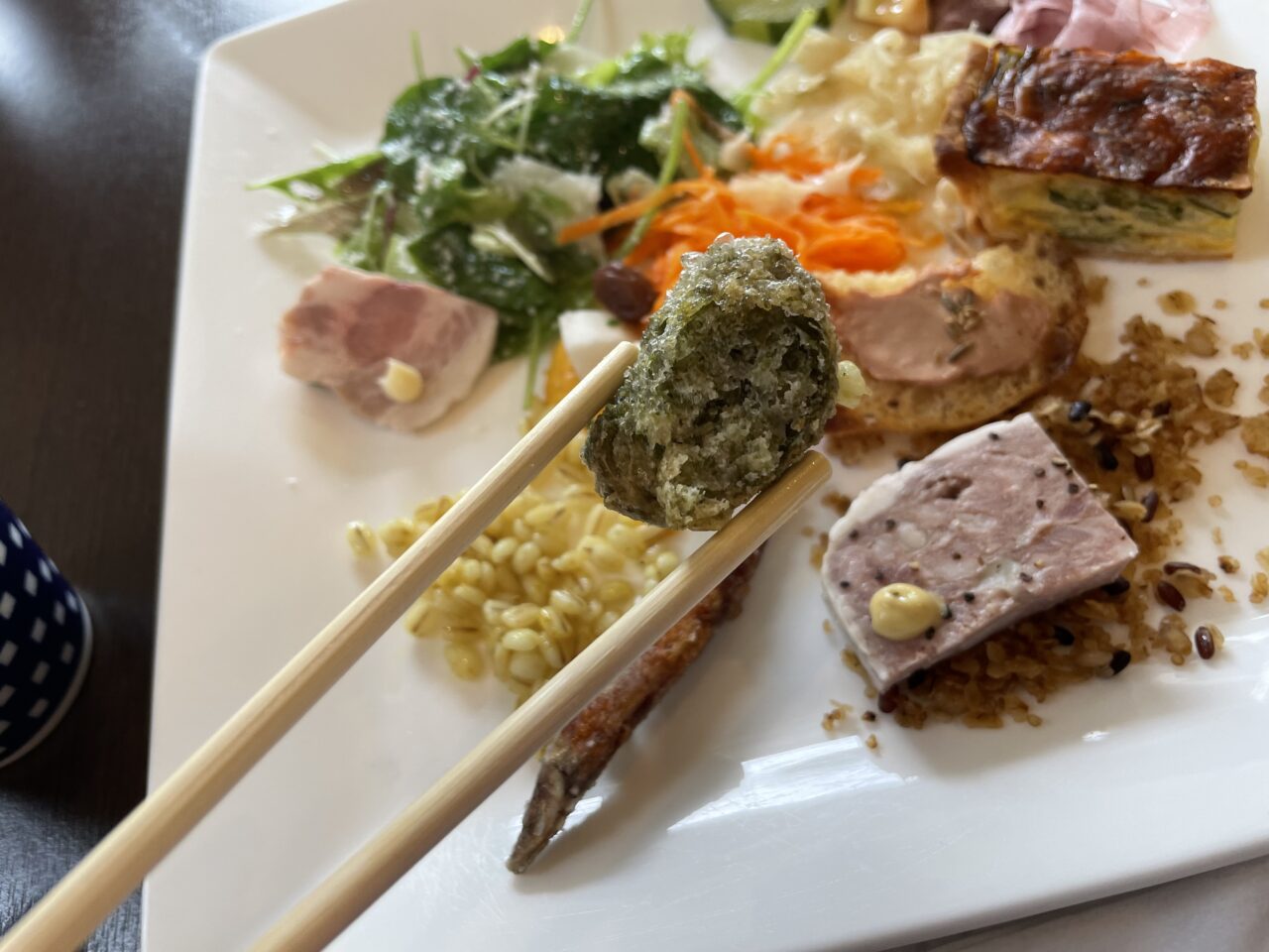 一番左手前にある緑色のフライは海苔が練りこまれているようで、癖になるちょっと変わったフライでした。