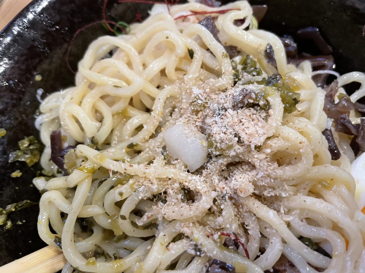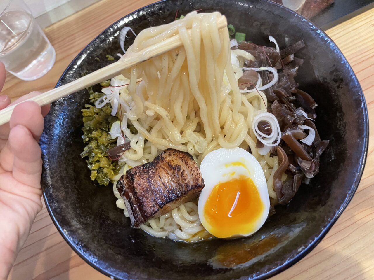 フワッと香る和風だし。濃厚でコクのあるたれを麺に絡め、たっぷりの具材もいっしょに混ぜ混ぜ。うまぁ~!!やみつきになります。