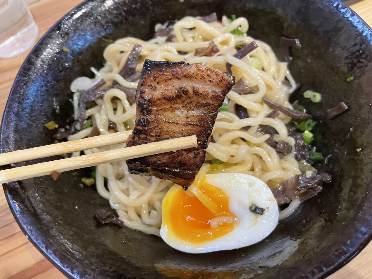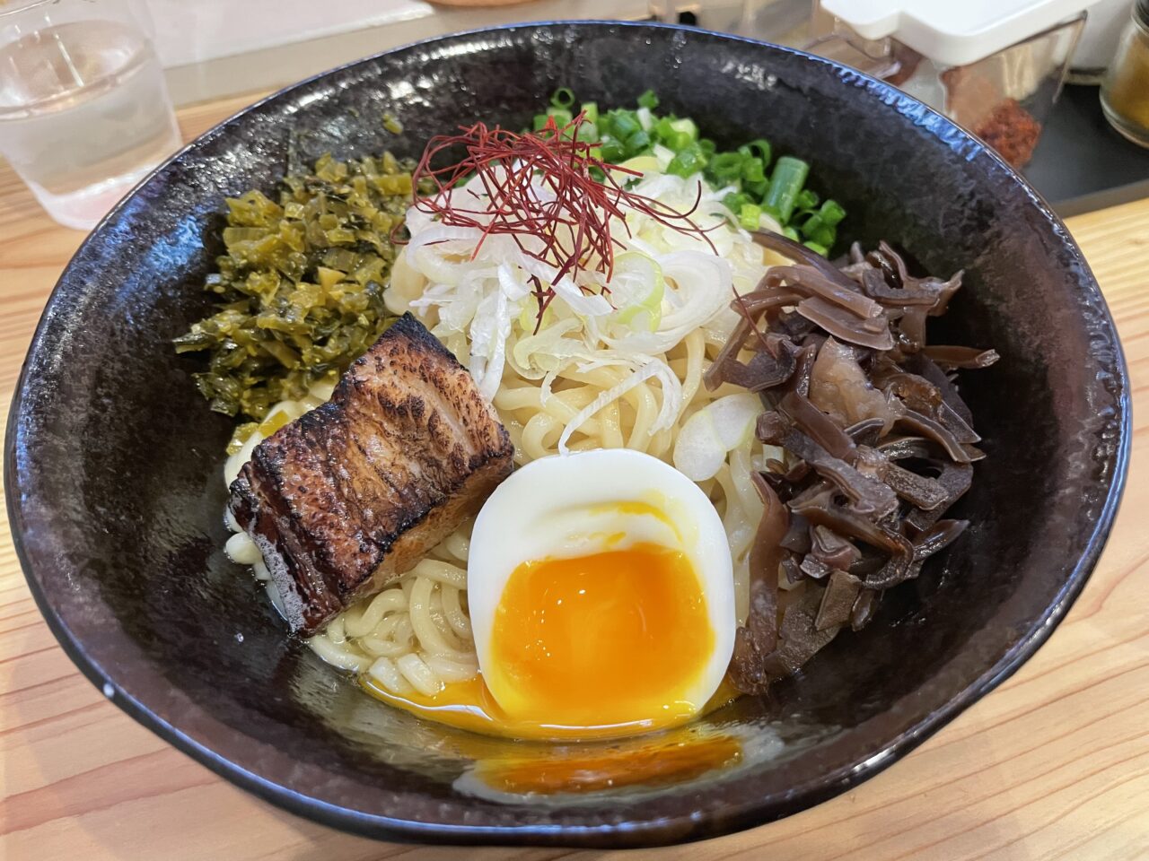 プルンプルンで肉厚な炙りチャーシュー。炙ってあるので香ばしくて口に入れるととろけるうまさ。麺ともよく合います。半熟卵も黄身が絶妙なやわらかさでした。はじめはシンプルに出てきたままの味を楽しみ、その後、すりごまをかけてみたり、にんにくを加えてみたり、いりこ酢をちょろっとかけてみたりしてみました。トッピングで飽きることなく違った味を楽しめて最後まで楽しみました。