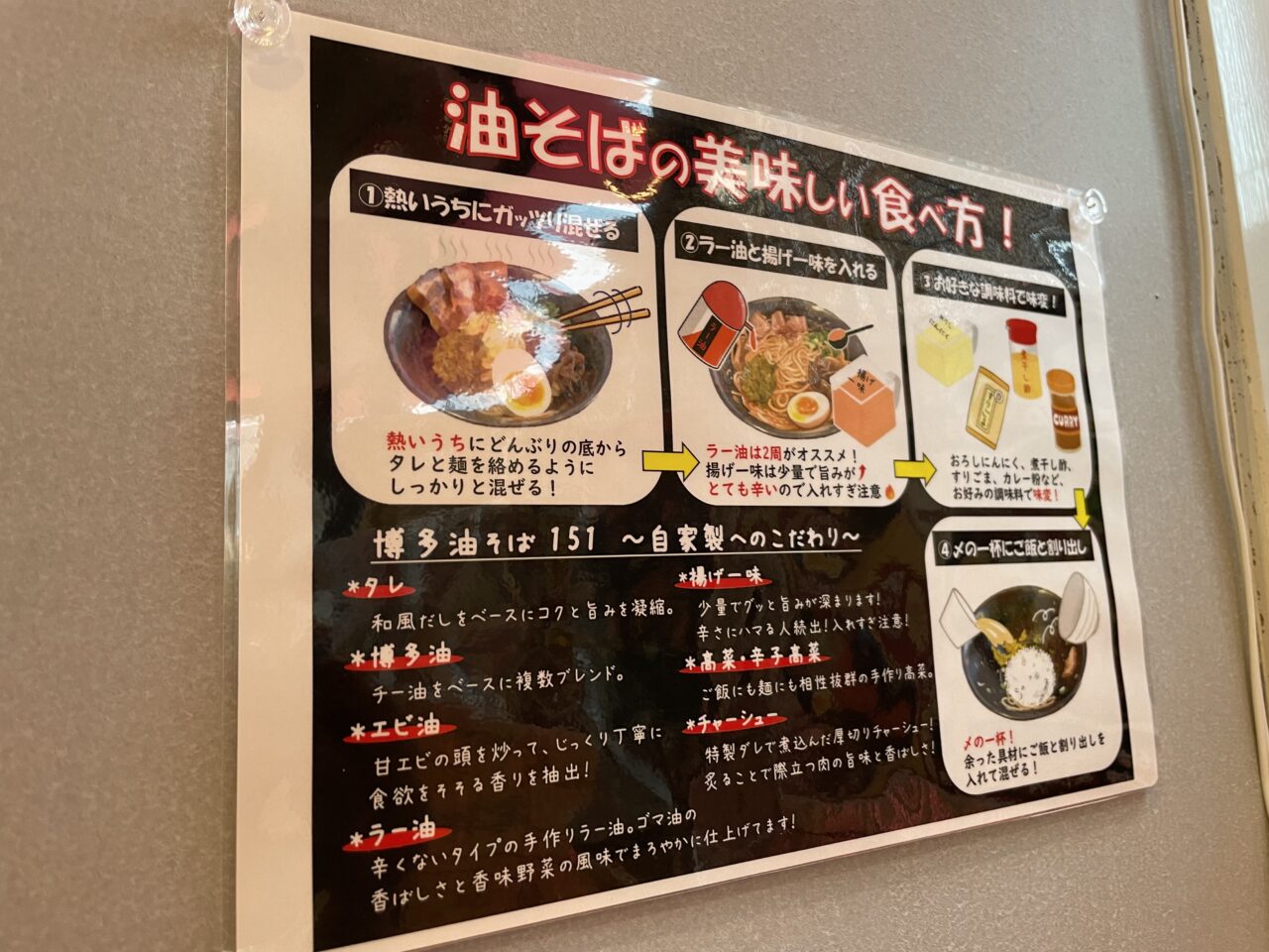 油そば初心者でも安心。美味しい食べ方という説明書きがありました。アレンジ調味料も各テーブルに完備してあるので、好きにカスタマイズして楽しめます。王道の博多油そばをオーダー。