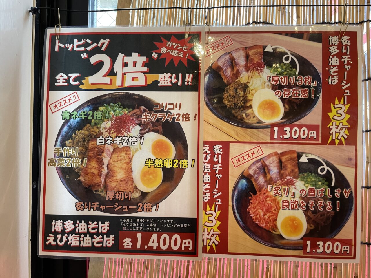 博多油そば、えび塩油そば、壱岐牛ローストビーフ博多油そば、壱岐牛ローストビーフえび油そばの4種類。