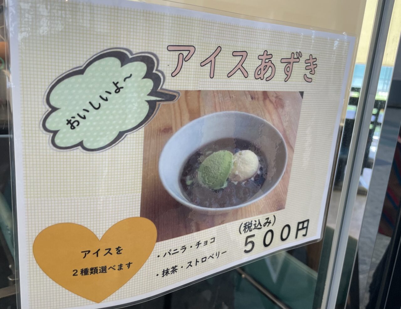 時間限定にはなりますが、ワンコインプレート(10時~11時半、14時~17時)などもあります。スイーツメニューも色々あります。和と洋の融合メニューアイスあずき。濃厚ガトーショコラなどもあります