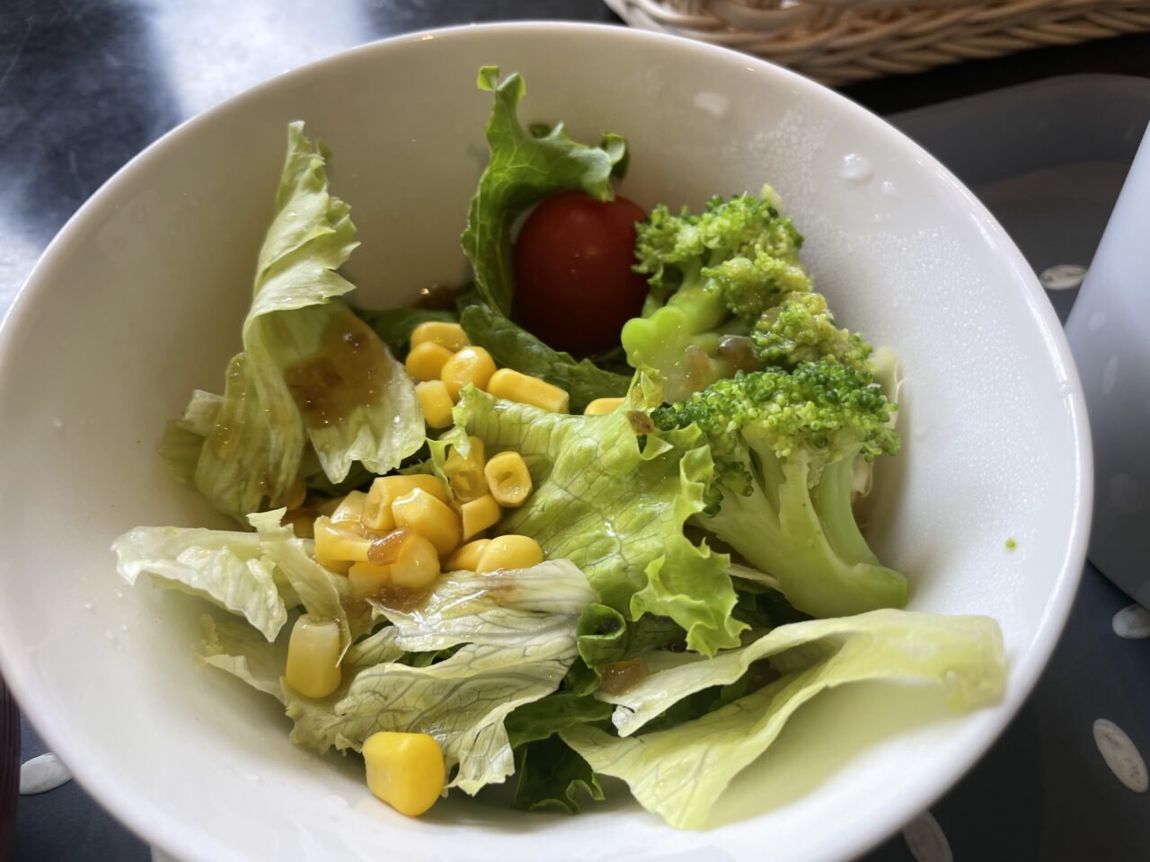 サラダはレタス、コーン、ブロッコリー、ミニトマトと王道のサラダ野菜たちが入っていました。