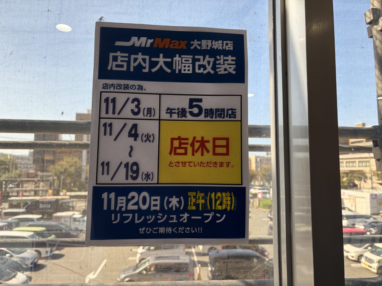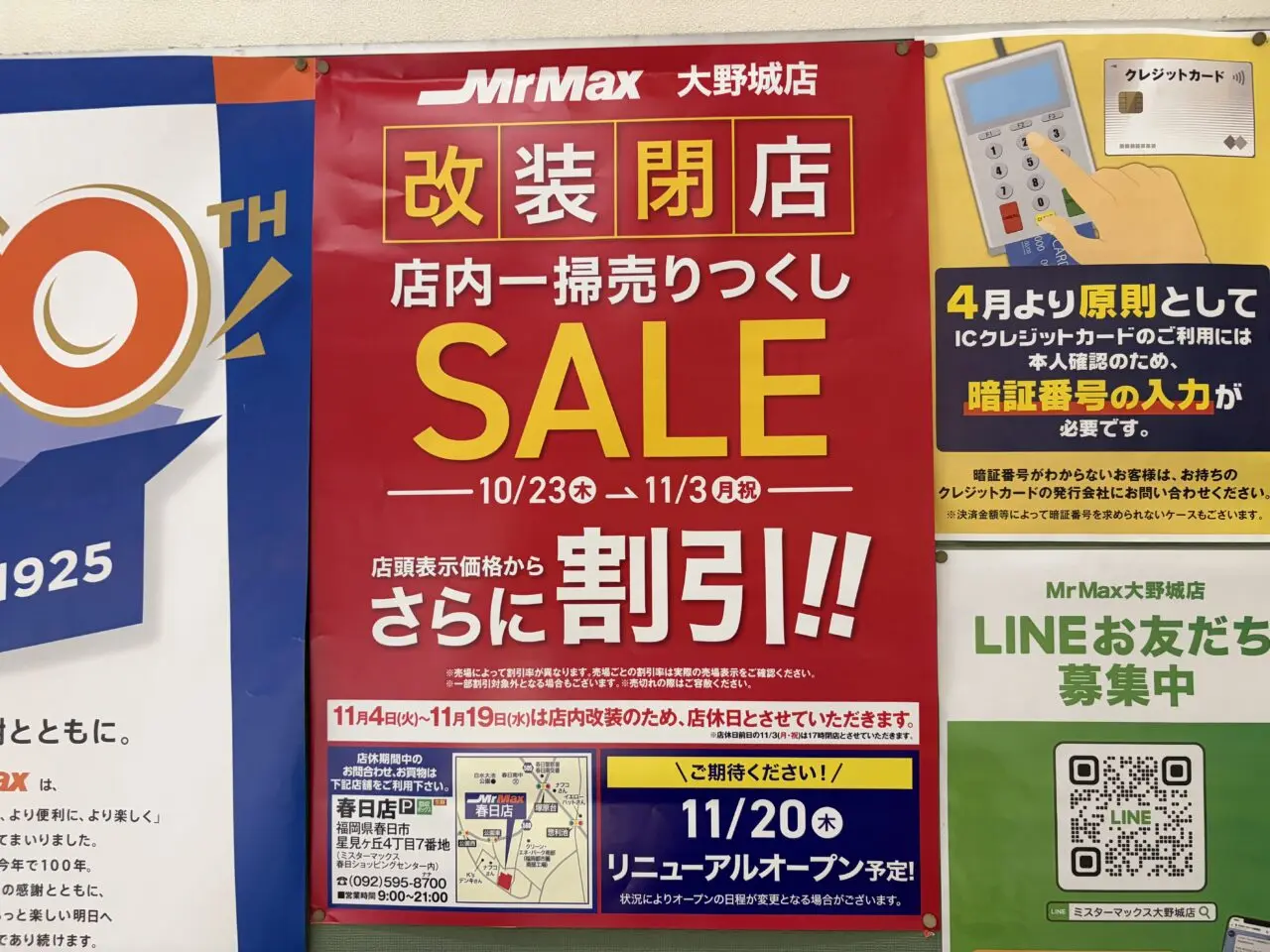 【大野城市】ミスターマックス大野城店がリニューアル工事のため一時閉店します。現在売り尽くしセール中!!