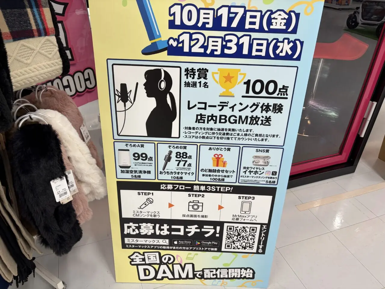 特賞は店内BGMのレコーディング体験♪あなたの歌声がミスターマックスのCMの歌声になるかも!!歌唱力に自信がある方はぜひ、挑戦してみてください。