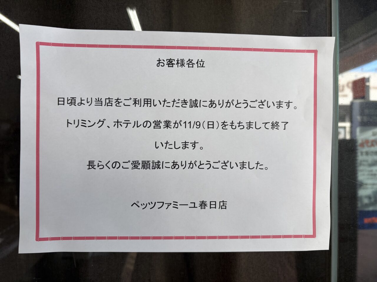 そして、もう一つ変わっている箇所が。ワンちゃん猫ちゃんや魚など販売されているペッツファミーユ春日店。そこにトリミング、ホテルが併設されていたのですが、営業終了となっていました。
