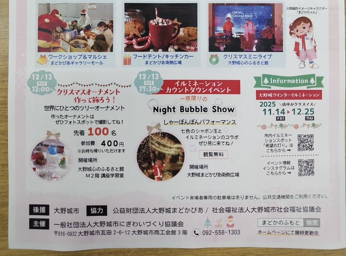 【大野城市】大野城クリスマスマーケット2025が今年も開催!一夜限りのイルミネーションとのコラボしたシャボン玉ショーやミニライブ、ワークショップやキッチンカーなど盛りだくさん。