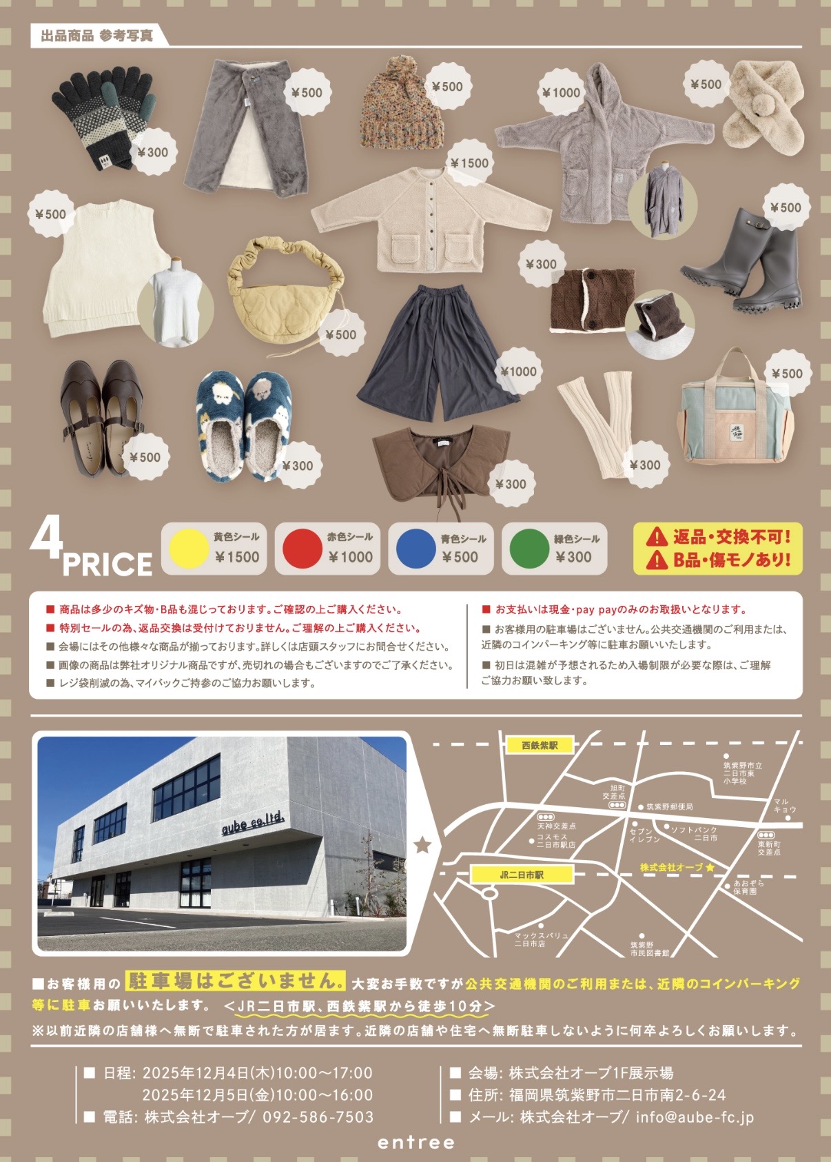 以前は大野城まどかぴあで年に2回、夏と冬に開催されていたカブシキガイシャ アントレのサンプルセール。2023年以降はJR二日市駅近くにある株式会社 オーブ 1F展示場で開催されています。