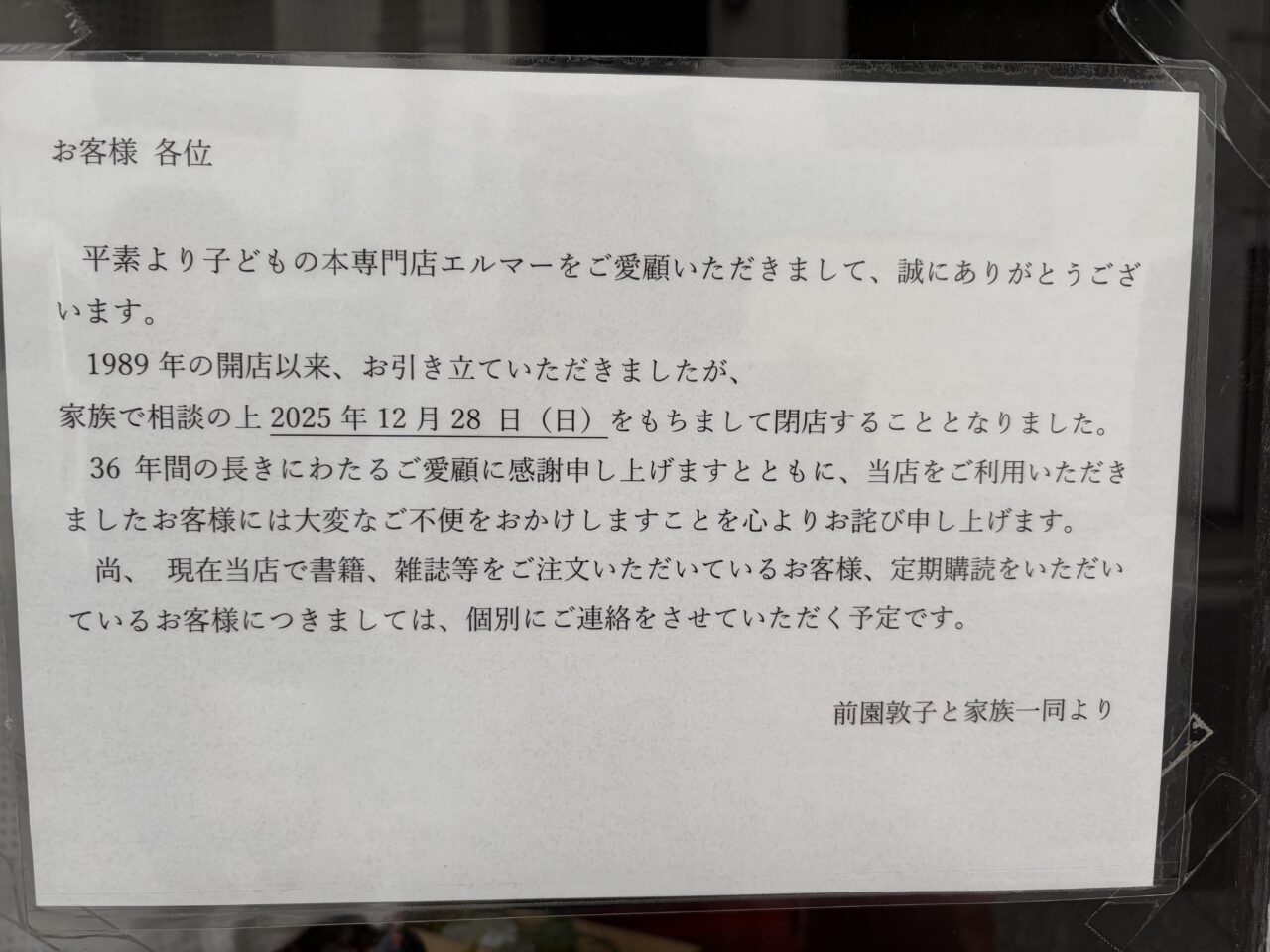 2025年12月28日をもって閉店してしまうとのこと。36年間という長きにわたり、絵本を販売するだけでなく、子育ての憩いの場としても親しまれたエルマー。閉店を惜しむ声がたくさん上がっていることと思います。