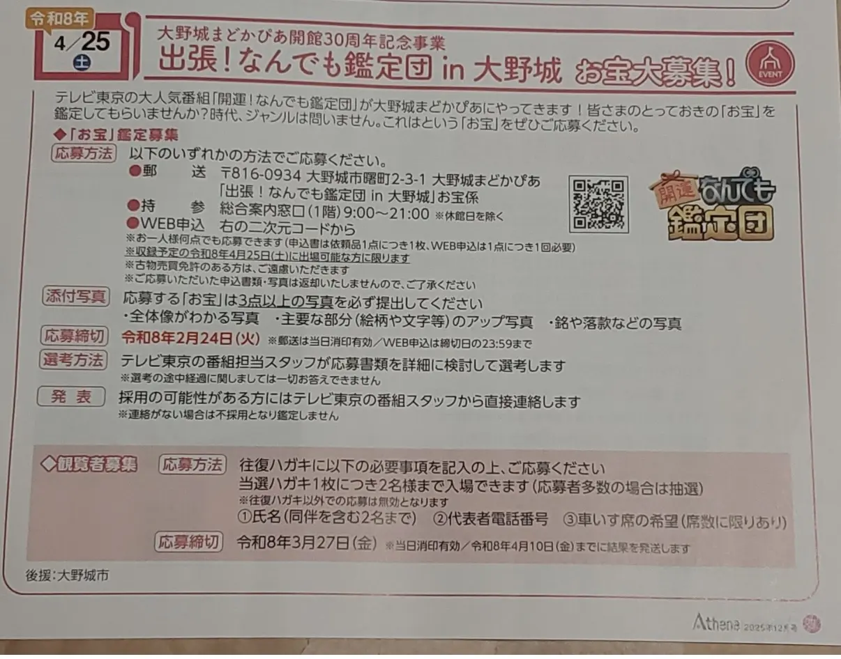 大野城まどかぴあ開館30周年記念事業でお宝を大募集中。なんでも鑑定団はテレビ東京の大人気番組。その番組で皆様のとっておきのお宝を鑑定してもらいませんか?