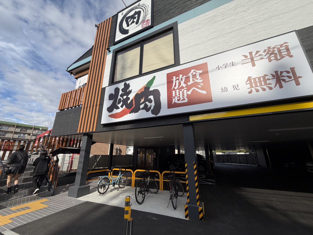 リニューアルオープンしたのは2025年11月12日!!どんな風に変わったのか体感しに行ってきました。一度取り壊し工事をしてから建物の建設していたので、新築でピッカピカです。店内入口は2階。階段横には駐輪場と店舗下一階部分が駐車場になっています。その奥にも駐車場が広がっていました。