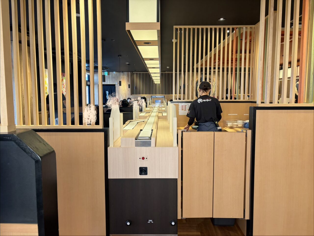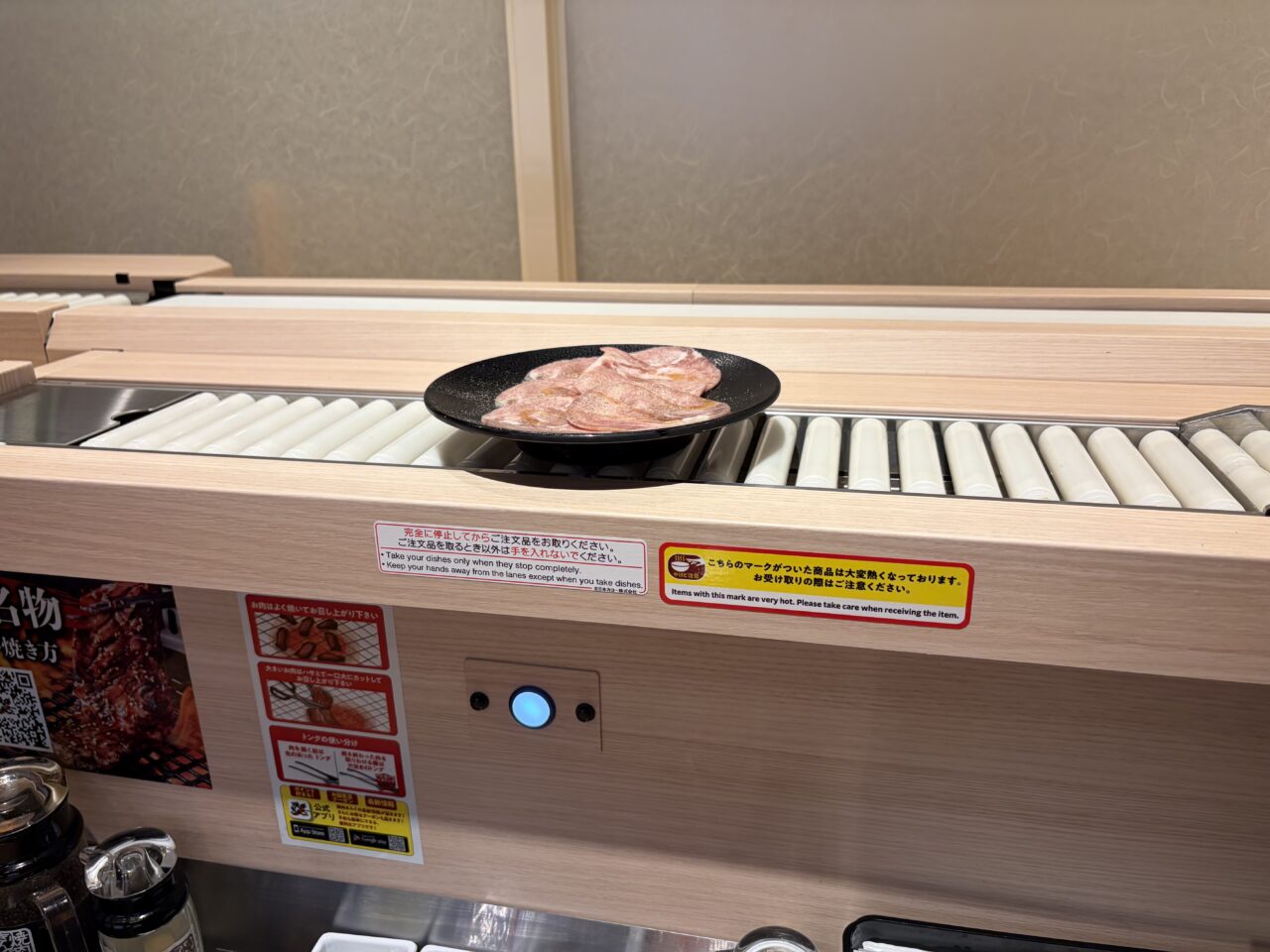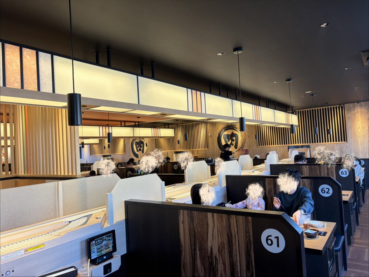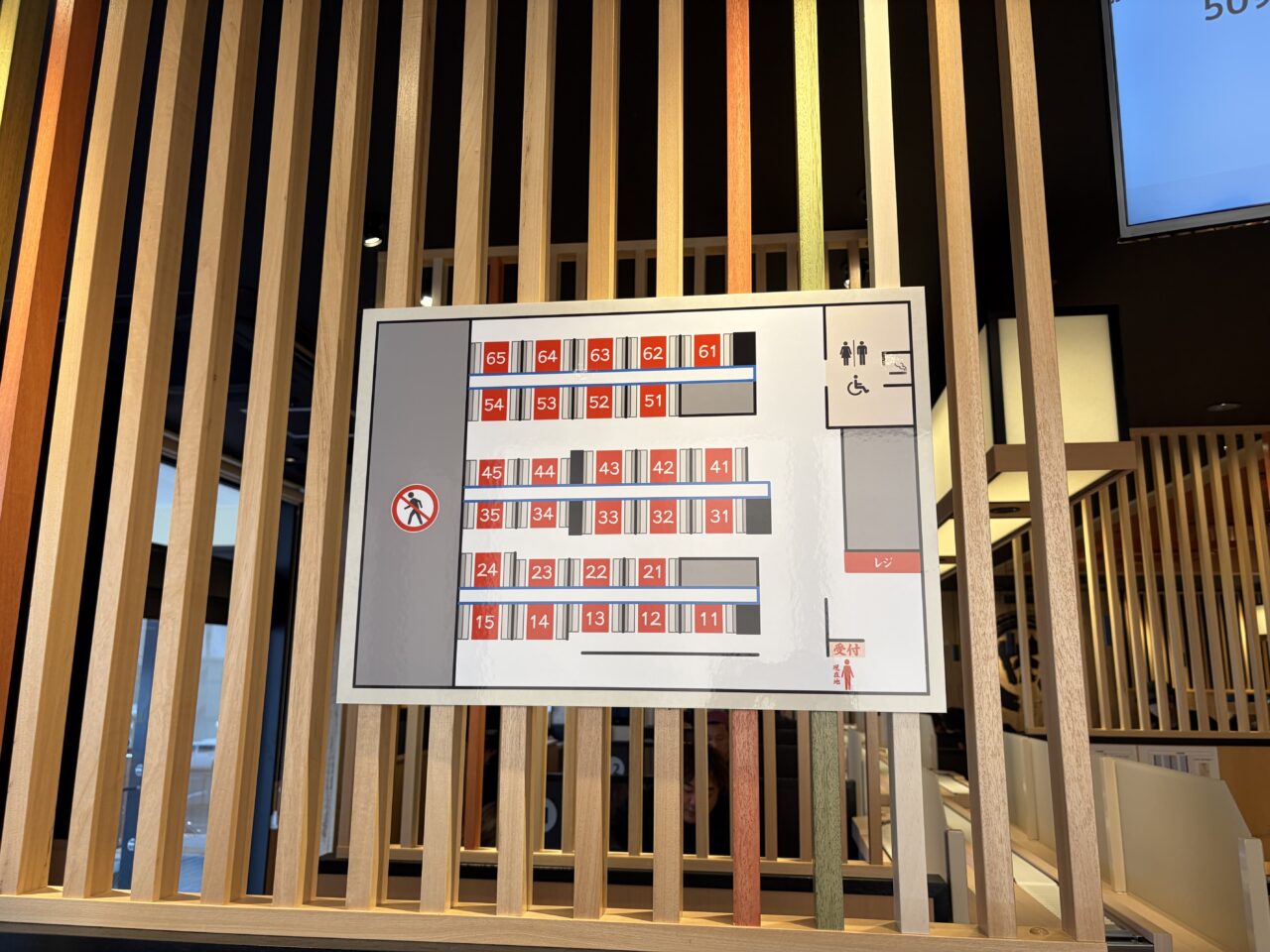 受付機上に座席ナンバーマップが貼ってあるので、確認してから行くとわかりやすいかもしれません。一番の違いはここ!回転すし屋さんのようなレーンが登場していました。このレーンで注文したものが流れてくる仕組み。