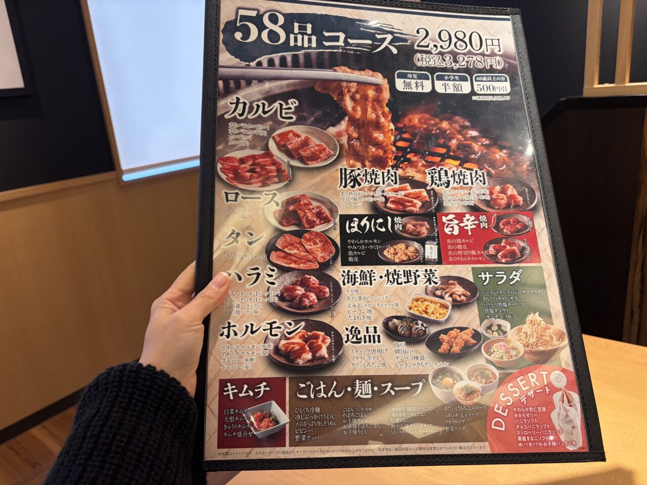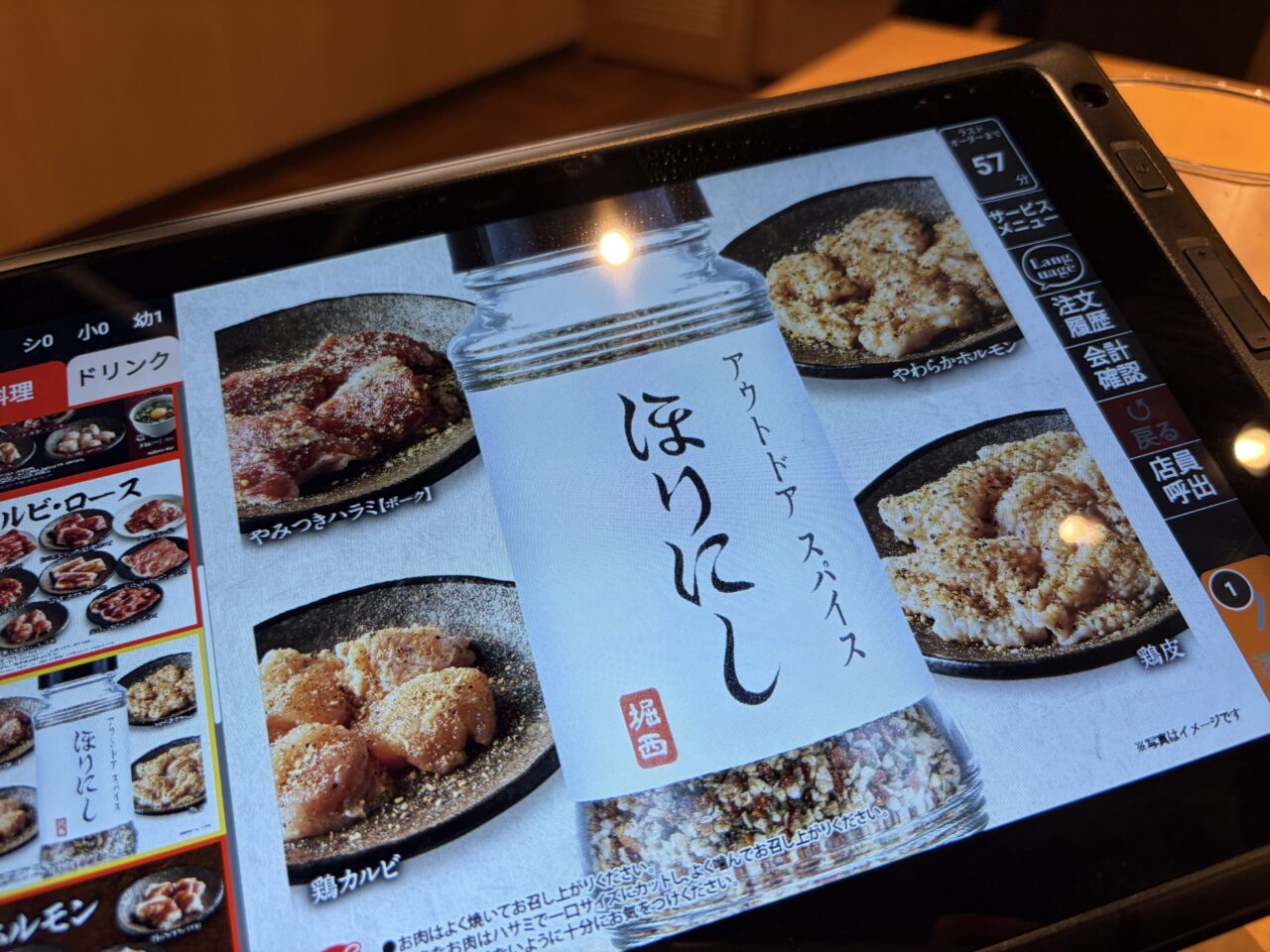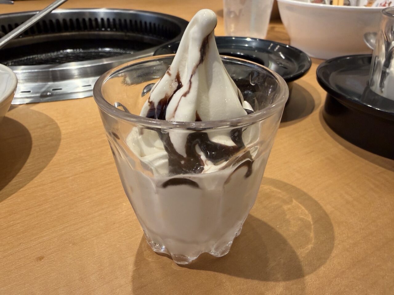キムチ盛合わせも食べ放題。焼肉との相性抜群です。未就学児無料なのに未就学児が喜ぶメニューが豊富。子連れにとっても優しいお店です。韓国のりも食べ放題。これまた嬉しい。ちょっと網が汚れてきたな~っと思っていると透かさずスタッフが「網交換いかがですか」と声をかけてくれました。タイミングが絶妙すぎて感動です。綺麗になった網でまたお肉を楽しめます。アウトドアスパイスで有名なほりにしをふりかけたお肉もあったのでオーダー。ほりにしがたっぷりかかっています。良い感じに焼けました。お肉も柔らかくてほりにしが良い味を出していました。スープも飲み放題。優しいスープの味が箸休めにぴったりです。ほっとする一杯でした。最後はデザート。ソフトクリーム。みかんゼリーと杏仁豆腐をぺろりと平らげました。お腹いっぱいお肉を食べたはずなのにデザートは別腹ですね。