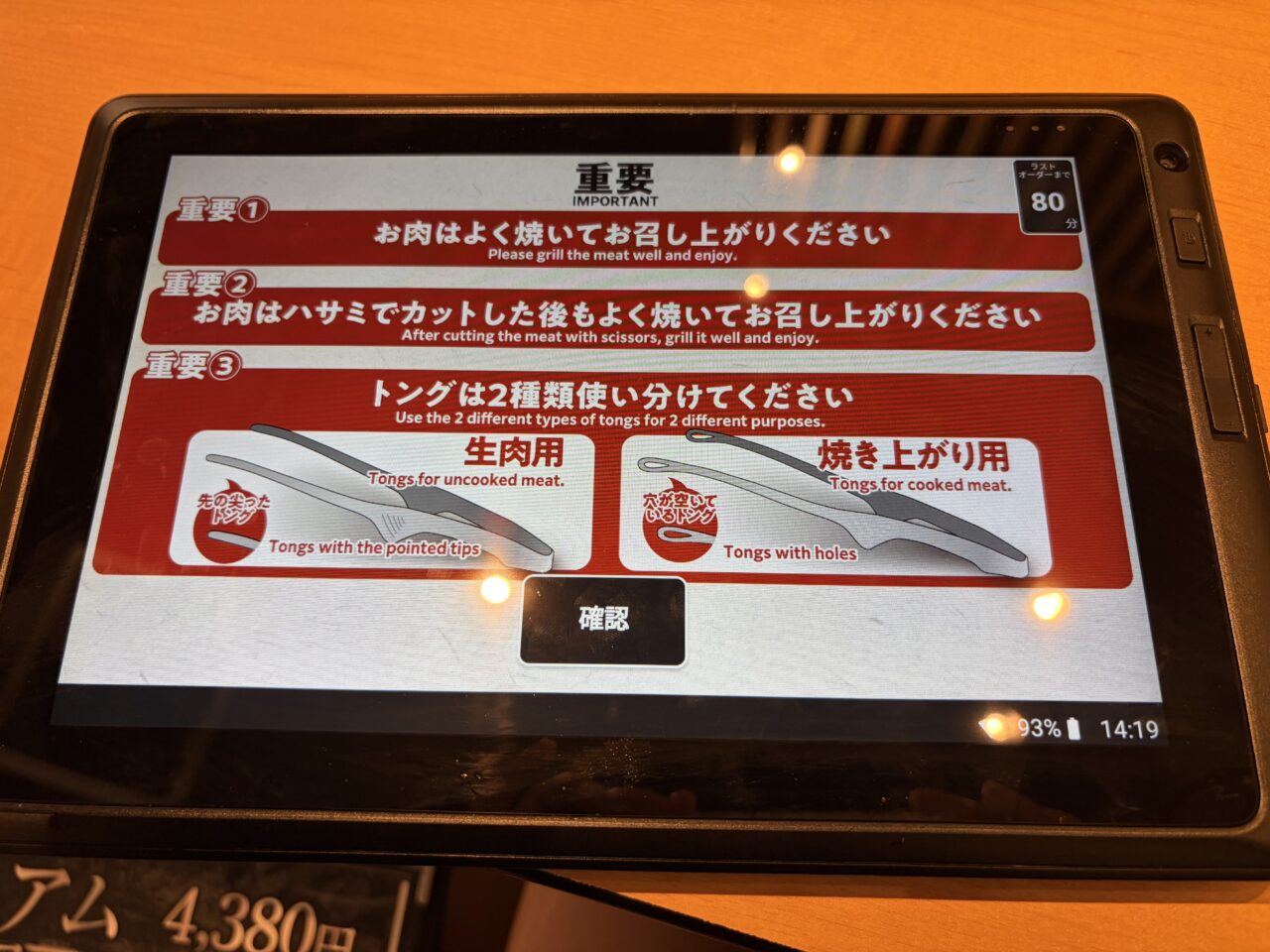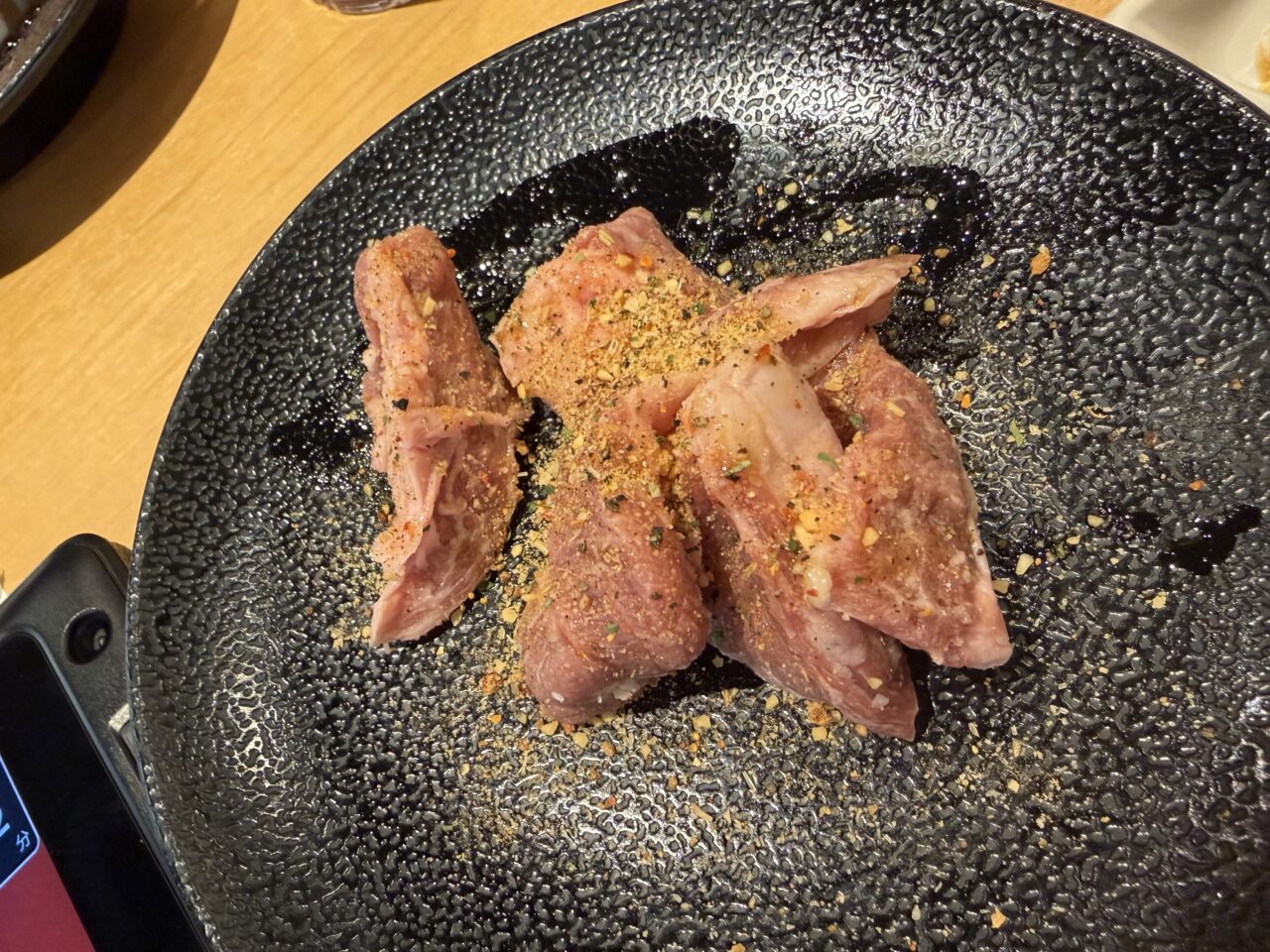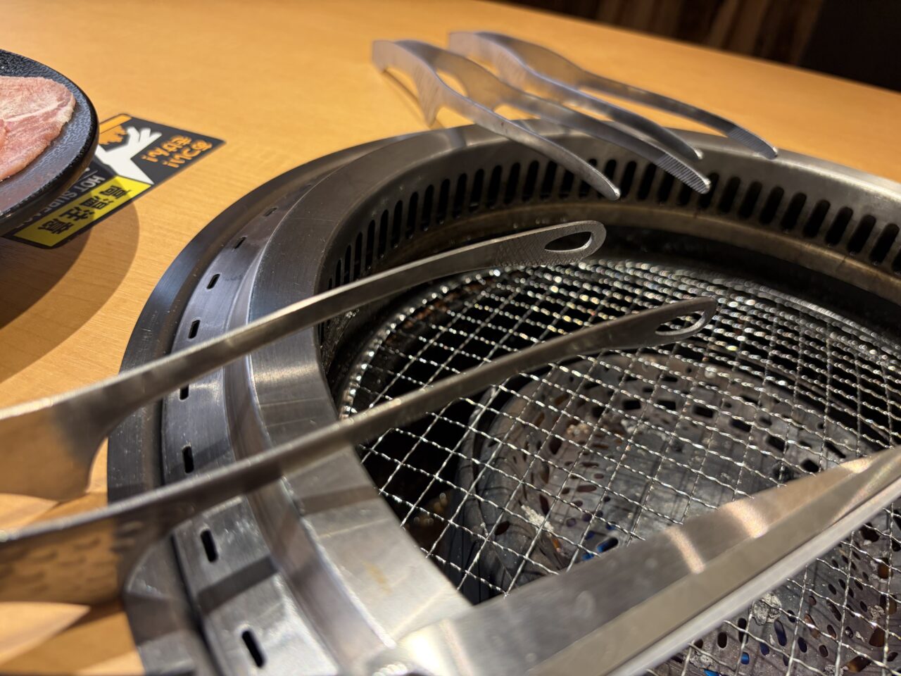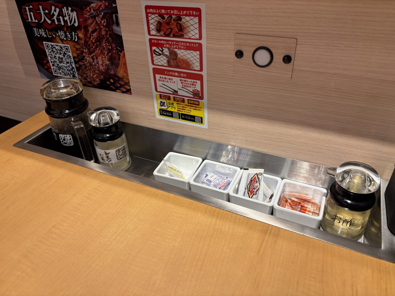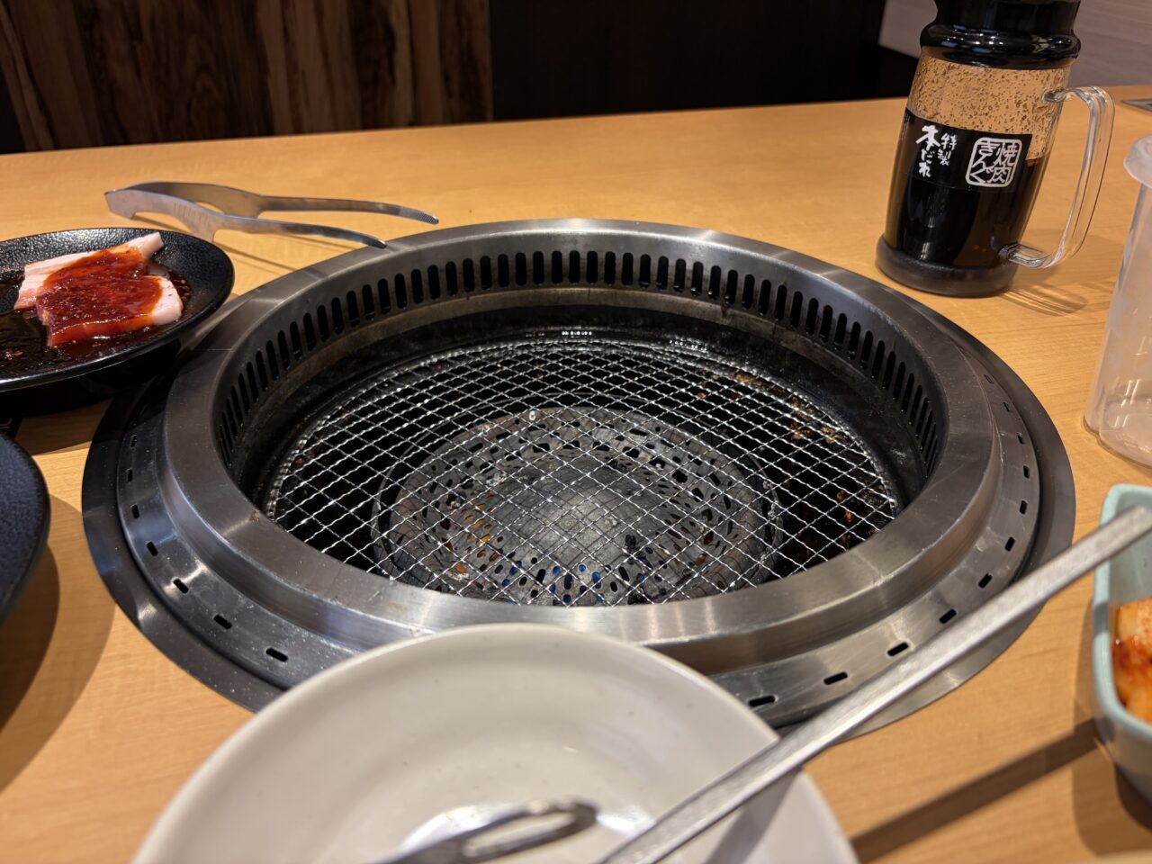 食中毒予防のため、しっかりとトングも生用と過熱後用に分けられていてスタッフの方も丁寧に説明してくれます。先の尖ったトングが生用で穴が開いているトングが過熱後のお肉用。タレなどの調味料も一通り各テーブルに完備してあります。