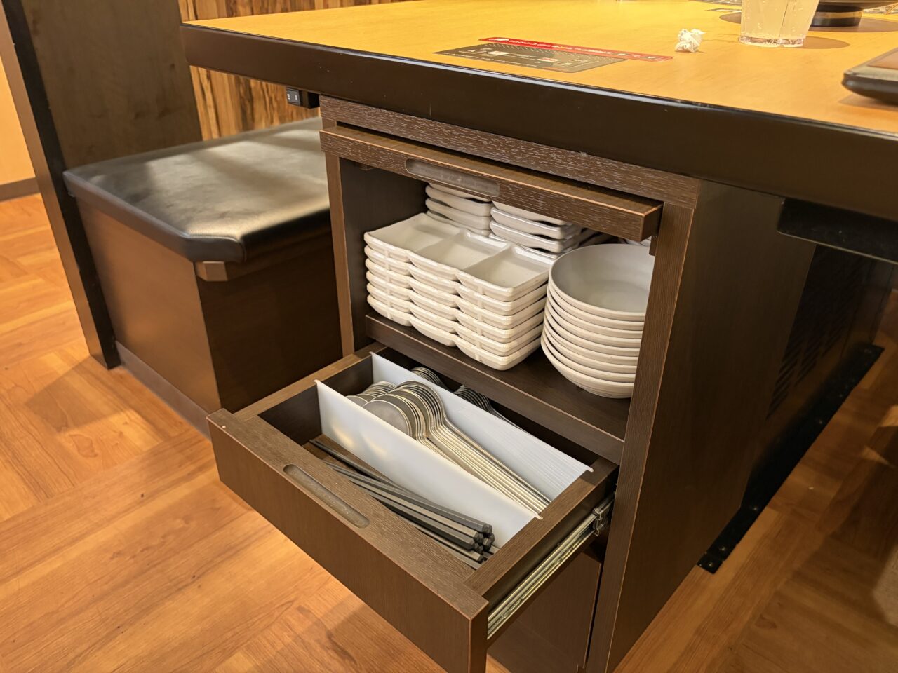 各テーブル横には引き出しがあり、箸やスプーン、取り皿、おしぼりなどが収納されています。セルフでとれるので便利です。