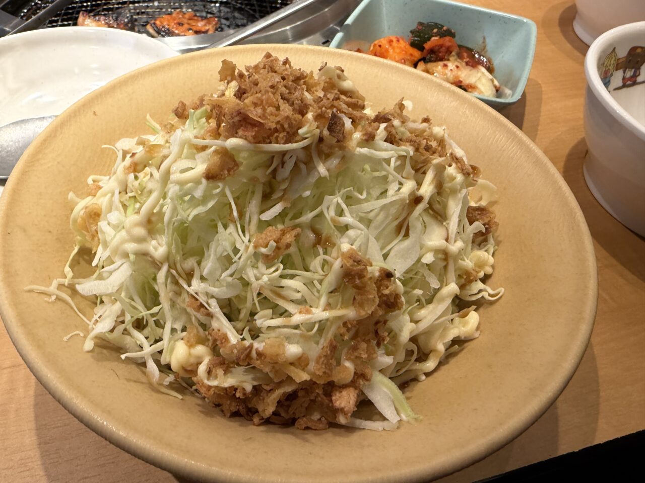 お肉を食べたらやっぱりサラダが欲しくなる。もりもりのサラダとカリカリ食感のフライドオニオンがアクセント。