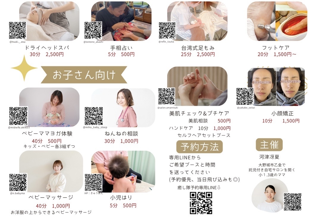 骨盤ケア×タイ古式マッサージ、アロマスプレー作り、アロマ肩回りマッサージ、姿勢チェック&アドバイス、もみほぐし、ドライヘッドスパ、手相占い、台湾式足もみ、フットケア、美肌チェック×プチケア、小顔矯正