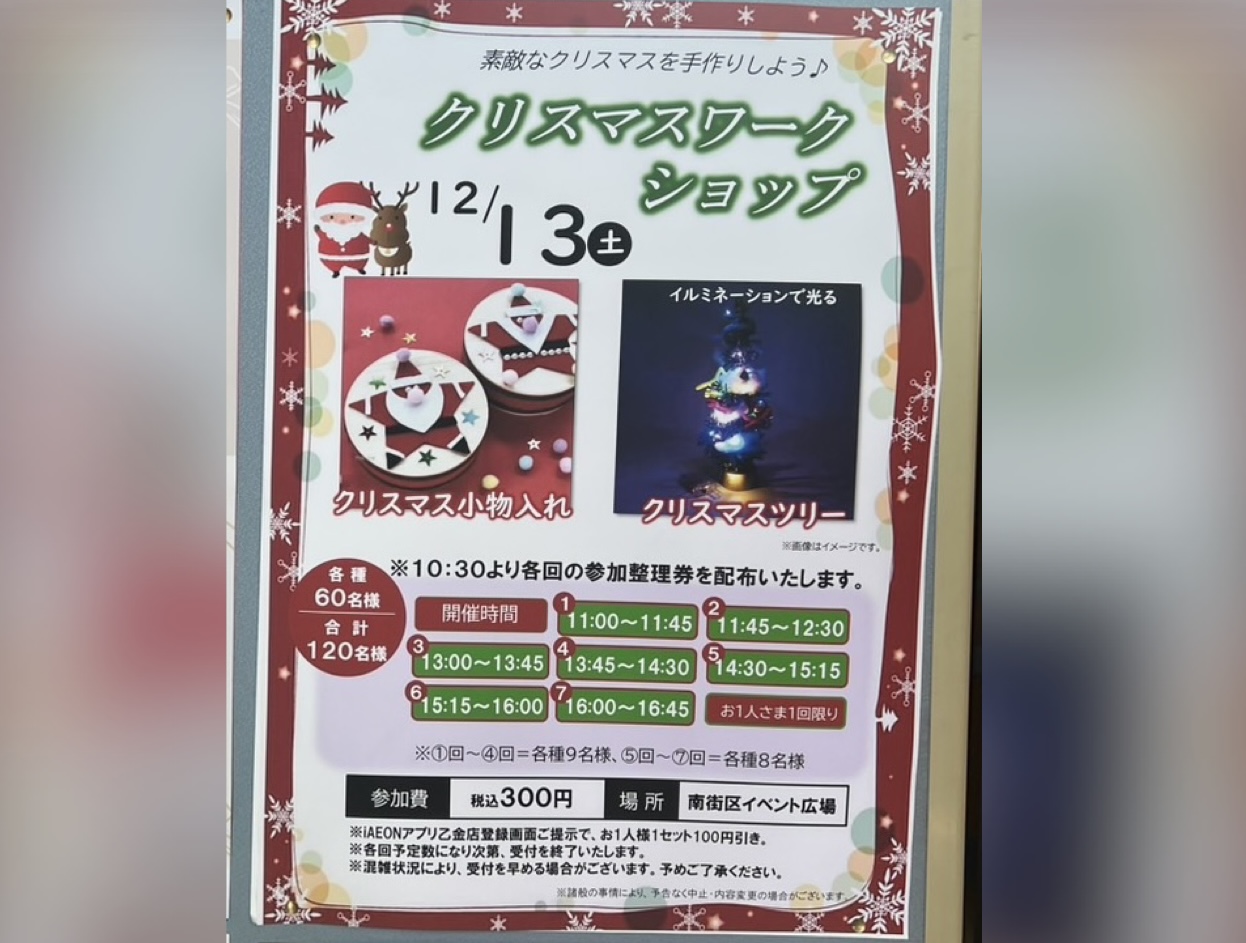 楽しいクリスマスの思い出が出来そうですね。ぜひ、イオン乙金ショッピングセンターで開催されるクリスマスイベントに出かけてみてくださいね~!!
