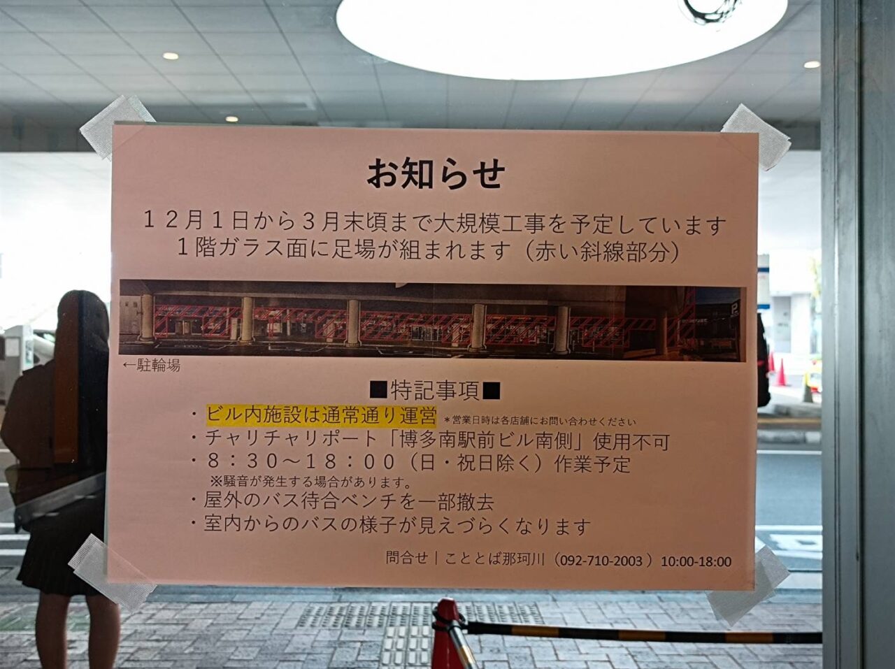 【那珂川市】博多南駅の老舗うどん屋さんが閉店していました。駅ビルは防水改修工事が行われています。