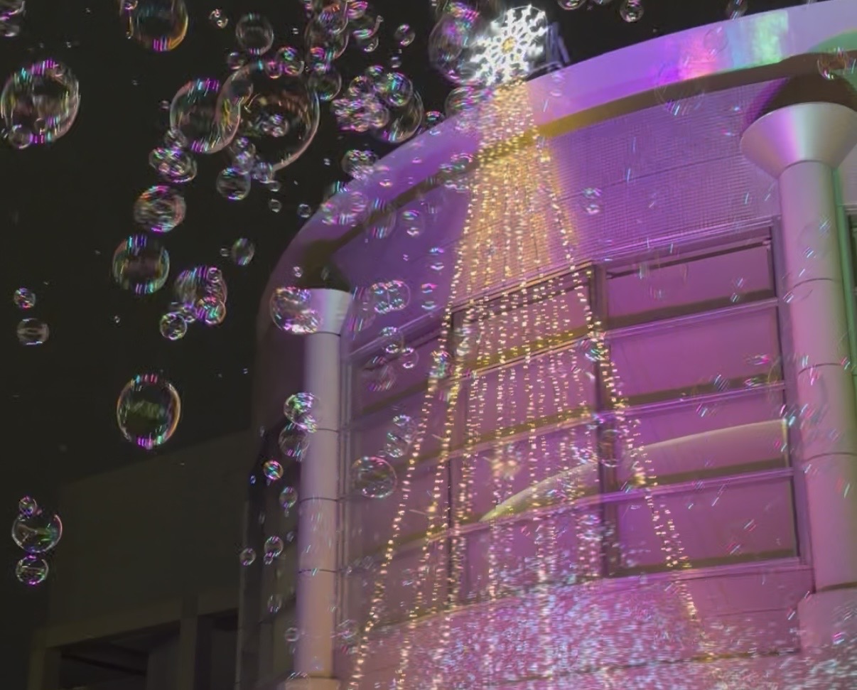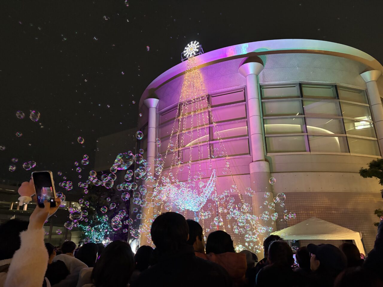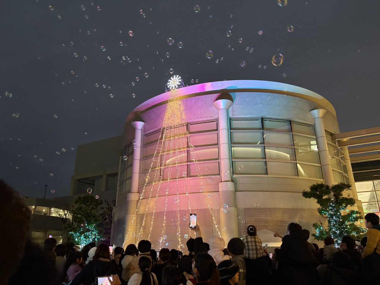 ライトアップと音楽と共に、大小さまざまなたくさんのシャボン玉が舞う様子は圧巻でした。