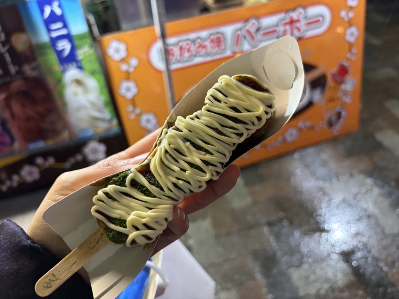 お好み焼き バーボーで豚バラをチョイス。ワンハンドお好み焼きで屋台グルメにピッタリ!
