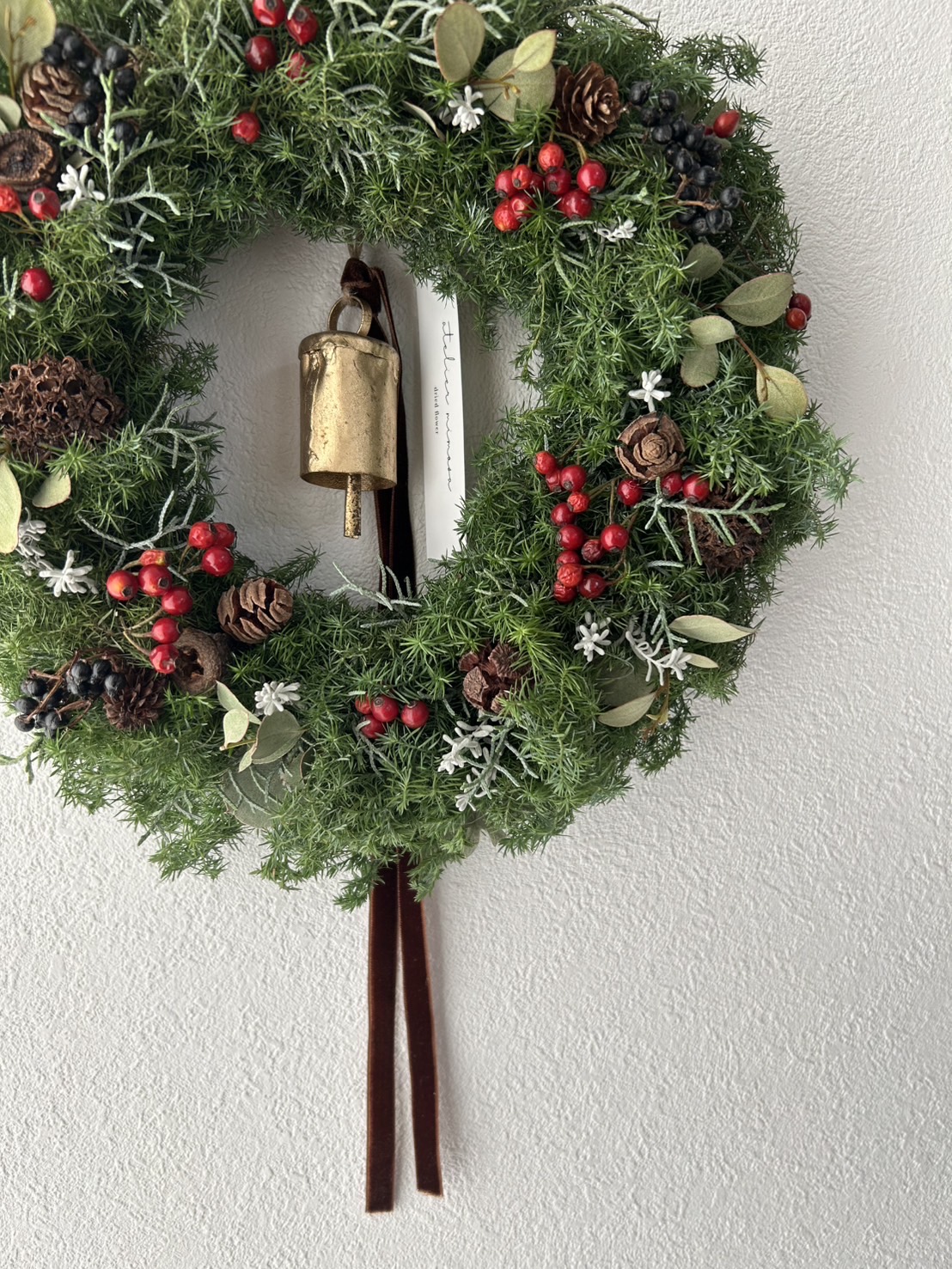 画像はアンティークベル付きクリスマスリース。クリスマスカラーの木の実にベロアのリボンがおしゃれなリース。ドライフラワーがふんだんに使われていてとってもおしゃれなのに、サイズ約30cmで3500円で販売されています。