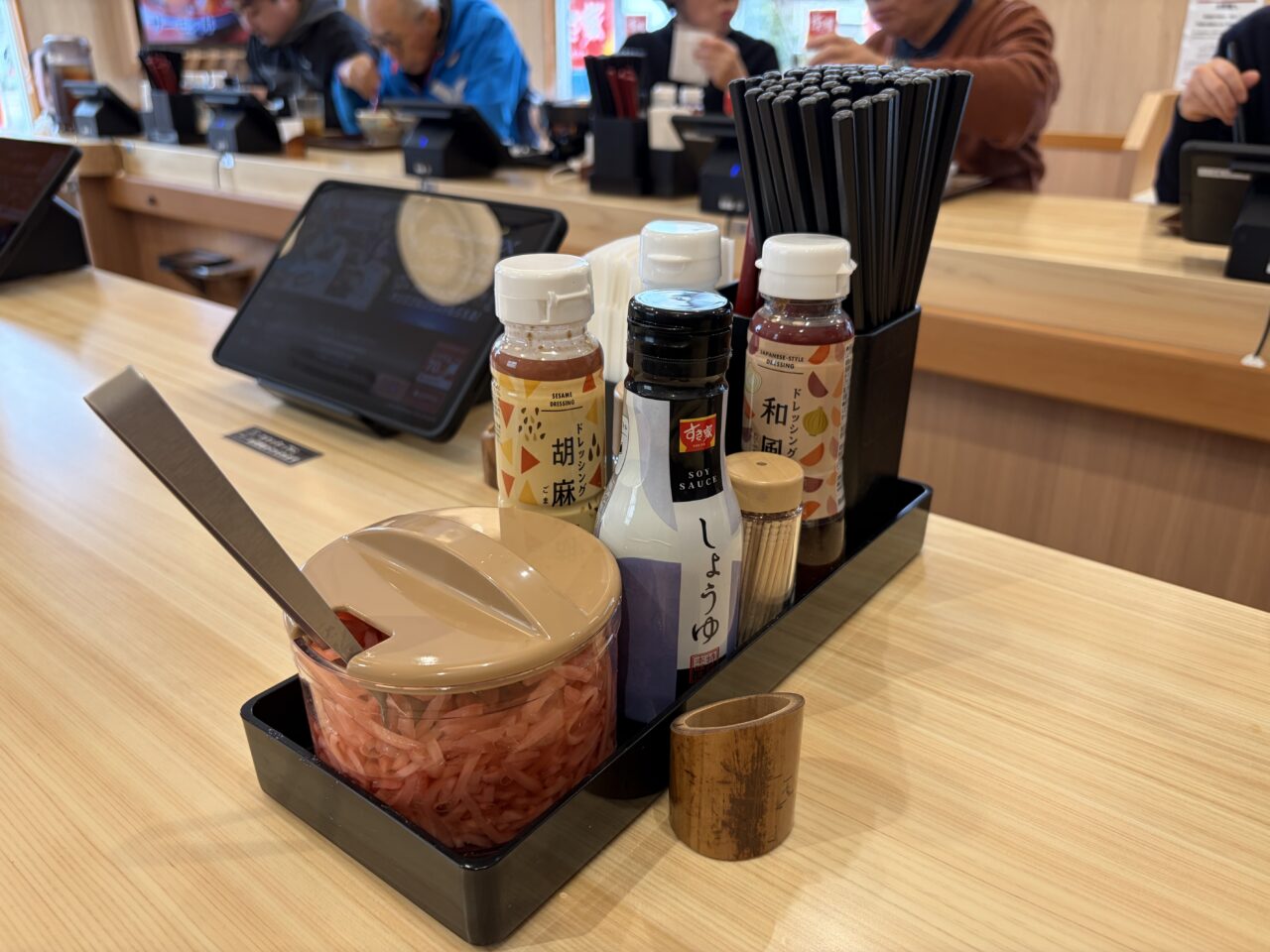 各テーブルに醤油や紅しょうが、ドレッシングなどがセットされているので、席を立たずに調味料が手に取れて便利です。