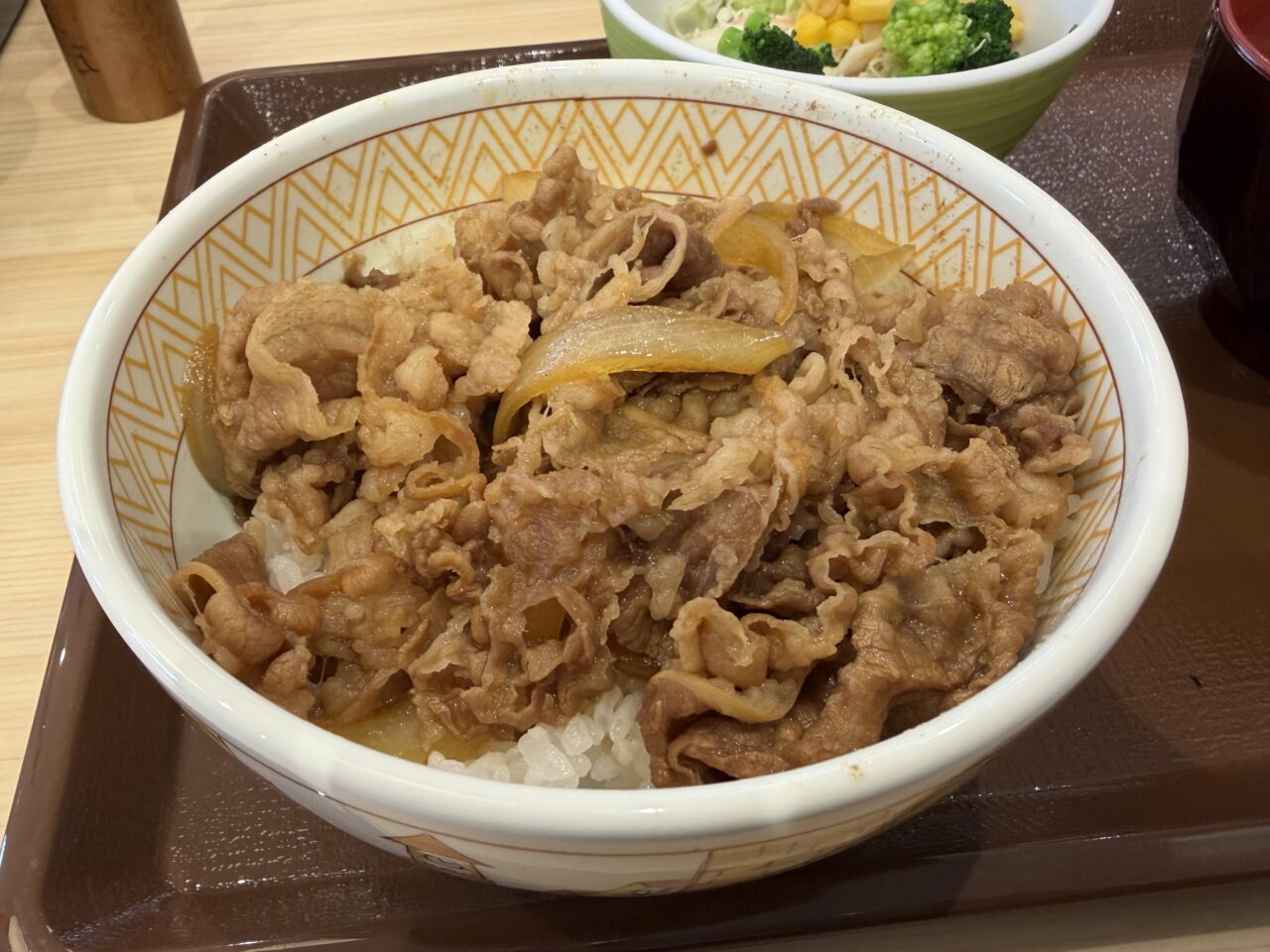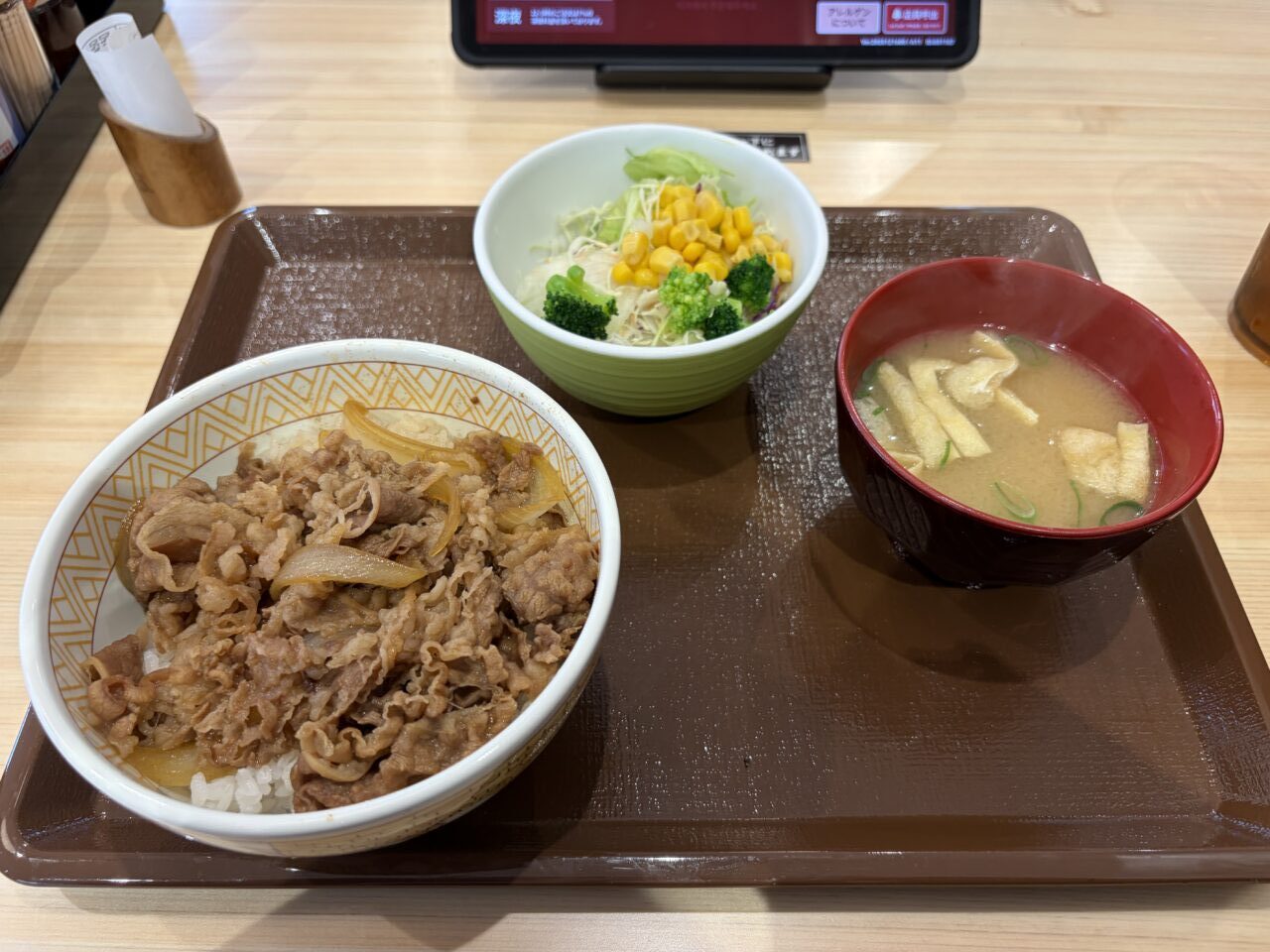 筆者は牛丼サラダランチセットをオーダー。待つこと数分であっという間に運ばれてきました。