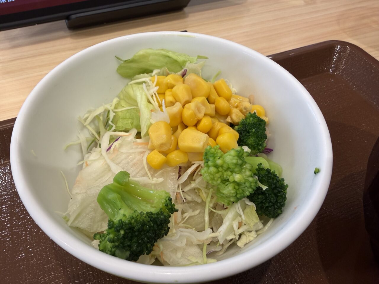 サラダはレタスとキャベツ、ブロッコリーとコーンで彩りもよく牛丼だけだと少し野菜不足を感じるので、野菜もしっかり摂れて嬉しいです。ドレッシングは胡麻、和風、フレンチの3種類がテーブルに設置してあり選べました。