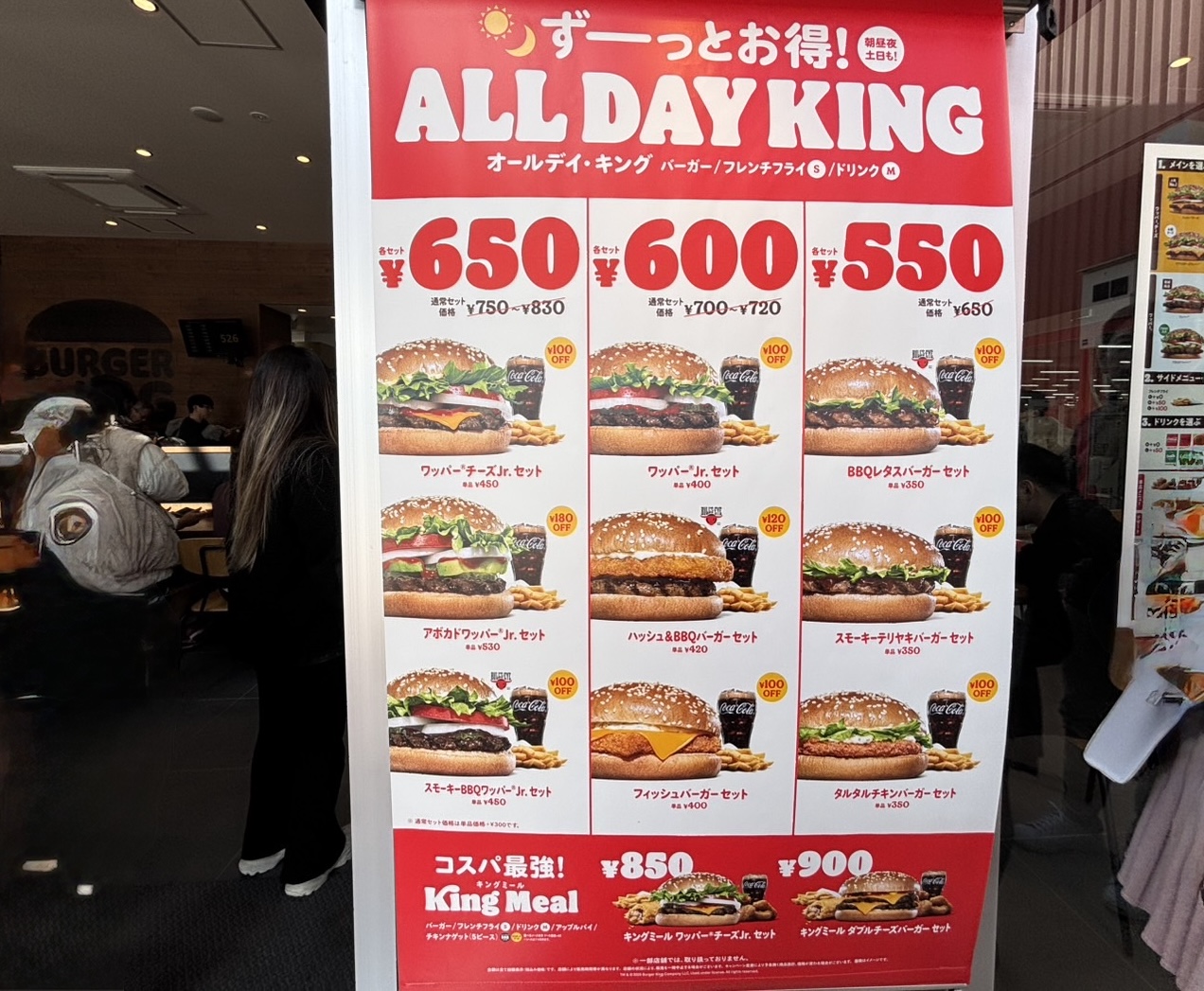 昼でも夜でも土日祝日でもオールデイお得なのってとっても嬉しい!!バーガーキングって勝手に少しお高目なハンバーガー屋さんだと思っていた筆者でしたが、むしろ安くてびっくり!