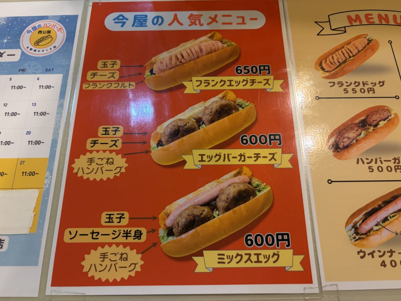ウインナーサンド 400円→ウインナーは半身なのでたくさん食べられないお子様や小食の女性などにぴったり♪+50円でエッグが追加されたエッグウインナーもあります。こちらはウインナーもエッグもどちらも入って450円お安いです。