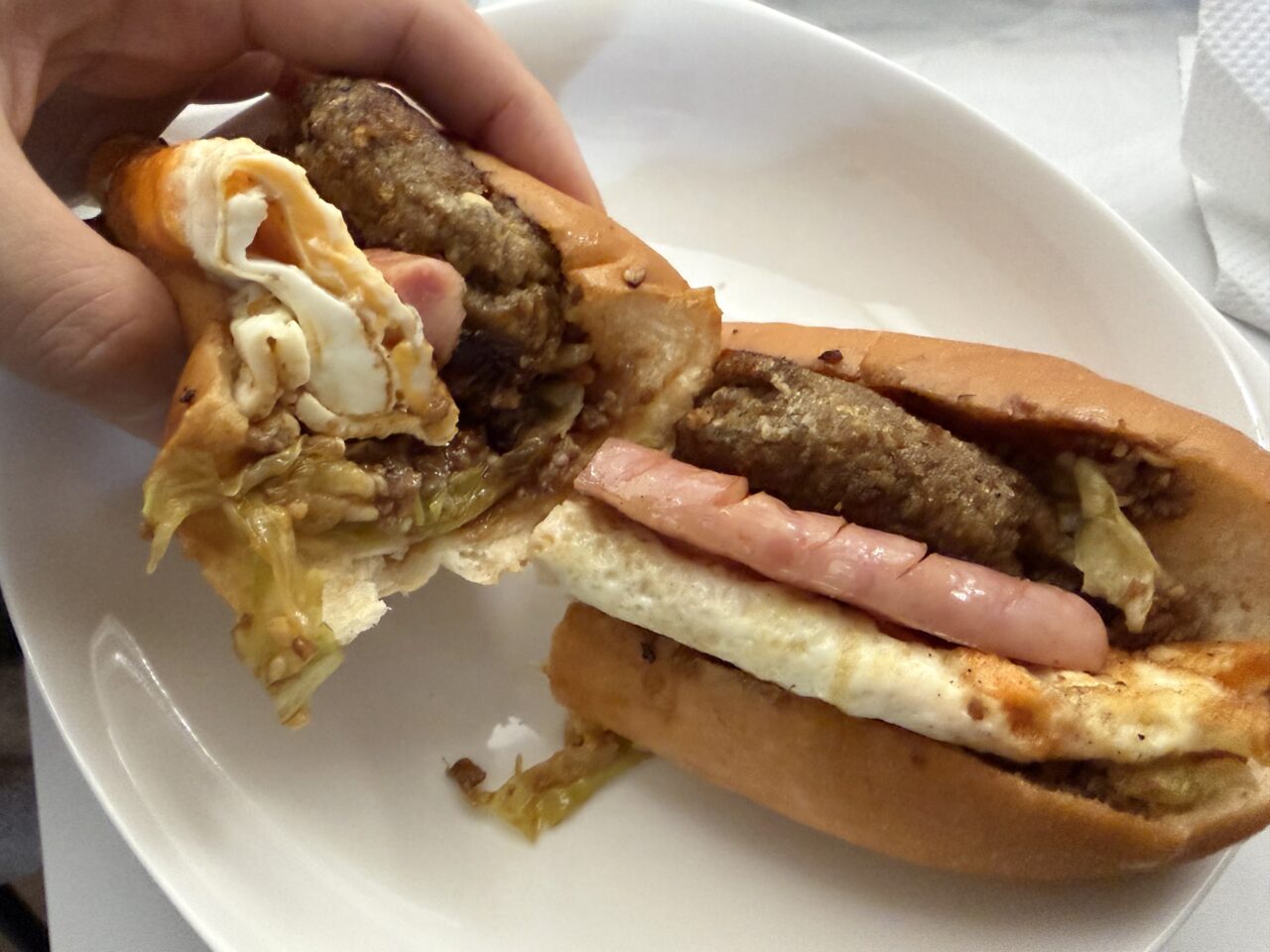 新メニューも気になりましたが、ここに来るとやっぱりこれを食べたくなります。パンからはみ出すこのボリューム。遠くからでもはるばるここまで食べにくる価値ありのおいしさ♪
