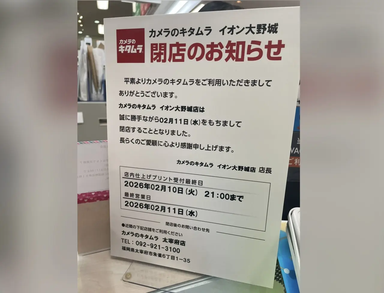 イオン大野城1階にあったカメラのキタムラ。2026年2月11日をもって閉店するそうです。